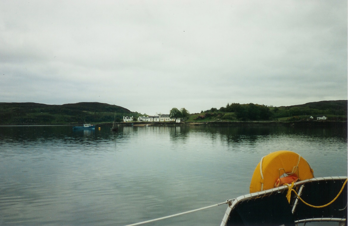 0700 Departed Puldoran before all the Northshore boats in NNW 12kn. Motored into the wind up the Sound of Mull. 0800 First brew-up. Guy had elderberry and pineapple brew which smelled like aftershave. 1000 Passed Duart Castle, and Alastair told the same story he tells every year about meeting Sir Charles Maclean there once. 1045 Dan cooked a massive fry-up for breakfast, which was eaten down below so that Guy wouldn't notice we were sailing past Tobermory - in 17 previous sailing trips, he has never before passed Tobermory without stopping at the Mish Nish hotel. 1215 Rounded Ardnamurchan point and hoisted sails. Sailed past the east side of Eigg and headed towards Skye. 1830 Wind died, so we dropped the sails and motored up the Sound of Sleat. 1930 Anchored in Isleornsay, which was quite full of boats. Spaghetti bolognaise washed down with Spanish red wine for dinner. 2030 Went ashore to pub. Met a crowd from the Royal Bank of Scotland in Edinburgh who were sailing a Dehler 34 - very fast but not as classy as our 'gentleman's yacht'. It must have been a bit cramped with 7 of them on board. 2330 Returned to Triskellion. Guy found his guitar and played the 4 tunes he knows. Then he played them again. Derek banned him to the cockpit where he played them again until the crew of the nearest boat told him to drown himself.